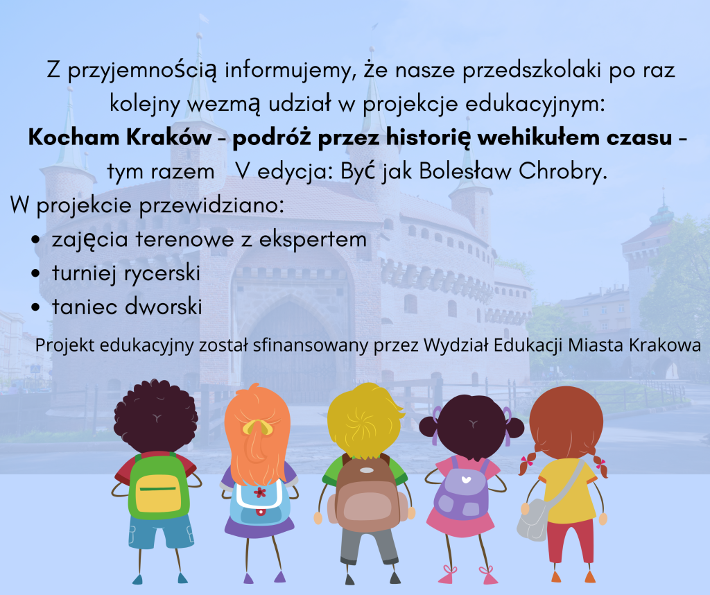 Z przyjemnością informujemy, że nasze przedszkolaki kolejny raz wezmą udział w projekcie „Kocham Kraków – podróż przez historię wehikułem czasu” tym razem V edycja „Być jak Bolesław Chrobry”